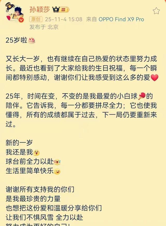 这场大战的序幕从一个生日开始。11月4日是孙颖莎25岁生日。她没有搞什么大排场,上午还在训练馆挥汗如雨,中午发了一条微博,轻描淡写地总结了自己的前半生:“25年,时间在变,不变的是小白球的陪伴。”这背后是无数个凌晨四点的辛勤付出。随后,她穿着简单的卫衣出现在机场,奔赴澳门。球迷们围着她喊“莎莎生日快乐”,她笑着挥手,眼神中透着稳当劲儿。据说当天她的午饭和晚饭都是在赶路的车上解决的。