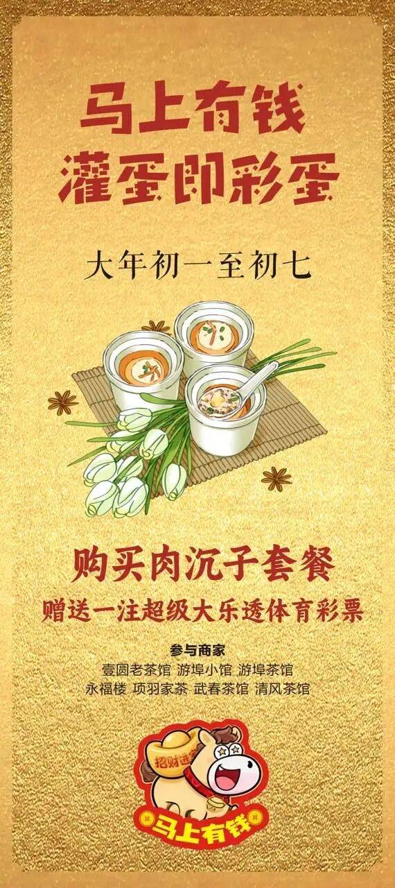 新春期间(2026年2月23日之前,即正月初一至初七),凡在壹圆老茶馆、游埠小馆、游埠茶馆、永福楼、项羽家茶、武春茶馆、清风茶馆这七家指定商家,购买肉沉子套餐,即可获赠一注“超级大乐透”体育彩票兑换券!