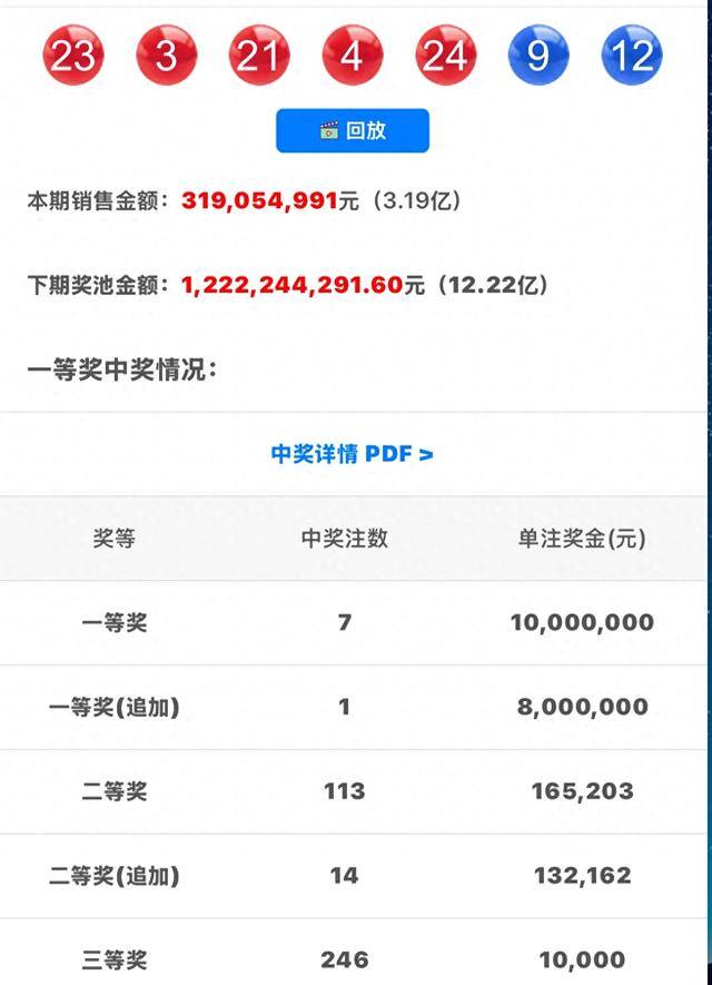 本期全国销售额为3.19亿元。累计筹集的公益金为1.14亿元。将用于全民健身、乡村振兴、教育助学、城乡医疗救助等多个社会公益领域。开奖后,奖池资金仍有12.22亿元,将滚入10月6日开奖的第25113期。